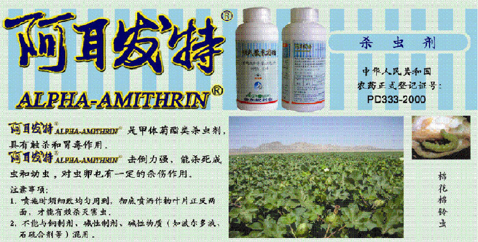 阿耳发特 ALPHA-AMITHRIN 注意事项 1.使用前必须仔细阅读产品标签,并严格按照标签内容使用。 2.建议应用原装进口AGROLEX新加坡利农喷雾器,细致喷雾于叶片正反两面,并在配药时加入柔水通,优化农用水质,消除药斑,提高药效! 3.喷施时须细致均匀周到,彻底喷洒作物叶片正反两面,才能有效杀灭害虫。 4.本品对鱼类及水生生物、蚕、蜂有毒,清洗喷雾器的水须妥善处理,切勿污染水源、桑田和蜂场。 5.本品不能与铜制剂、碱性物质、碱性制剂(如波尔多液、石硫合剂)等混用。 6.本品须贮存于阴凉、干燥及儿童触达不到之处,并远离食物、饲料和火源。 |